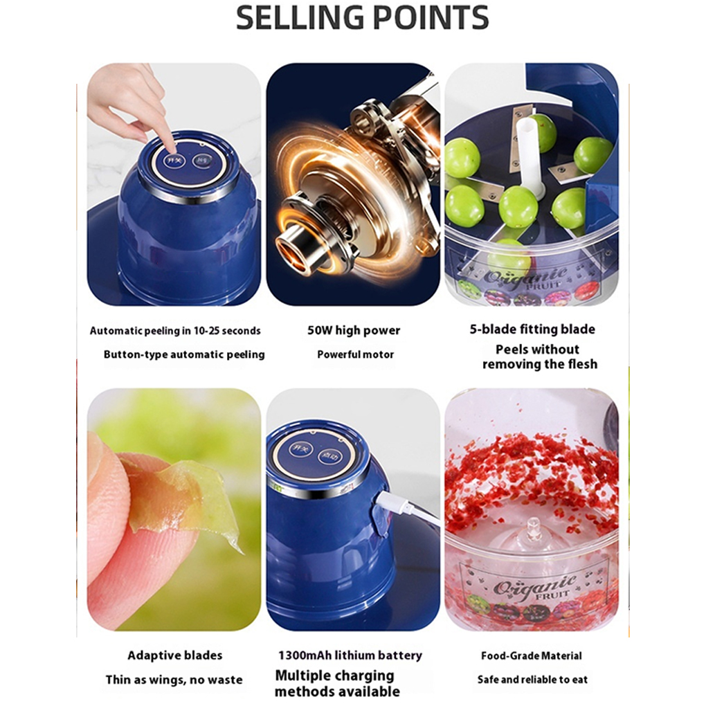 Quick Peeling: This grape peeler is equipped with a powerful 50W motor and a built-in 1300mAh lithium battery, which can peel grapes or cherry tomatoes in less than 20 seconds.